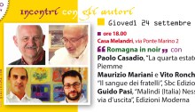 Giovedì 24 settembre GialloLuna NeroNotte propone l’appuntamento dal titolo “Romagna in noir”, al quale parteciperanno Guido Pasi (“Malindi (Italia) Nessuna via d’uscita”, Edizioni Moderna), Maurizio Mariani e Vito Ronchi (“Il sangue dei fratelli”, Sbc Edizioni) e Paolo Casadio, che ha appena pubblicato un intenso romanzo per Piemme, “La quarta estate”. L’incontro è fissato per le ore 18 a Casa Melandri, in via…